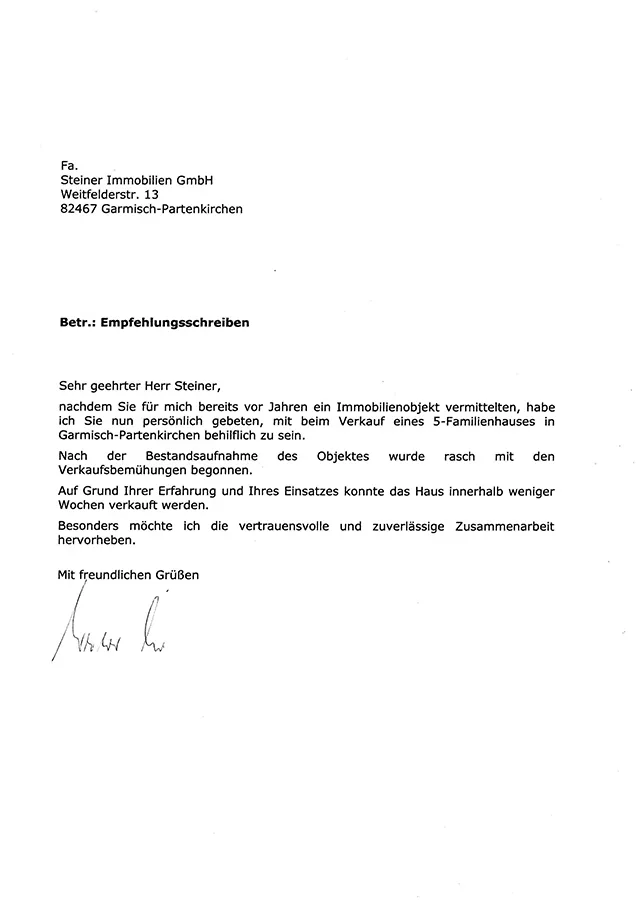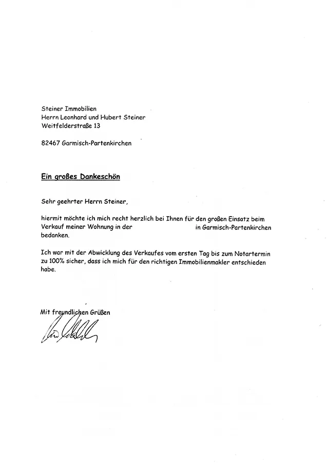 ... We zijn erg blij dat we u persoonlijk met uw familie hebben leren kennen en waarderen en hierbij ook de "Steiner IMMOBILIEN GmbH" als een uiterst betrouwbare partner voor de aankoop van onroerend goed ...