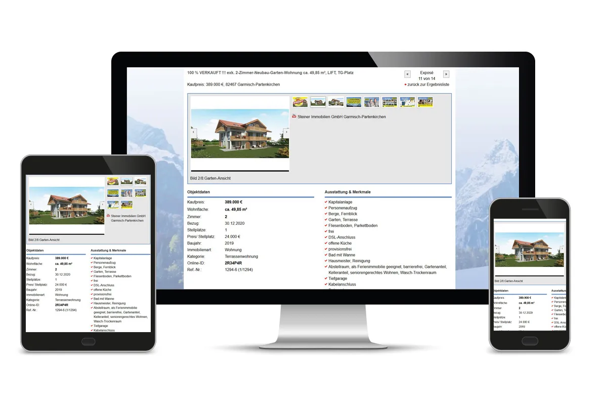 Die allgemeinen Plattformen unserer Partner wie Immoscout24, Immonet oder Immowelt erreichen ein breites Kundenspektrum und ermöglichen unkomplizierten Service. Auch Ihr Immobilienangebot wird von uns bei den Partnern online mit allen nötigen Informationen bereitgestellt.