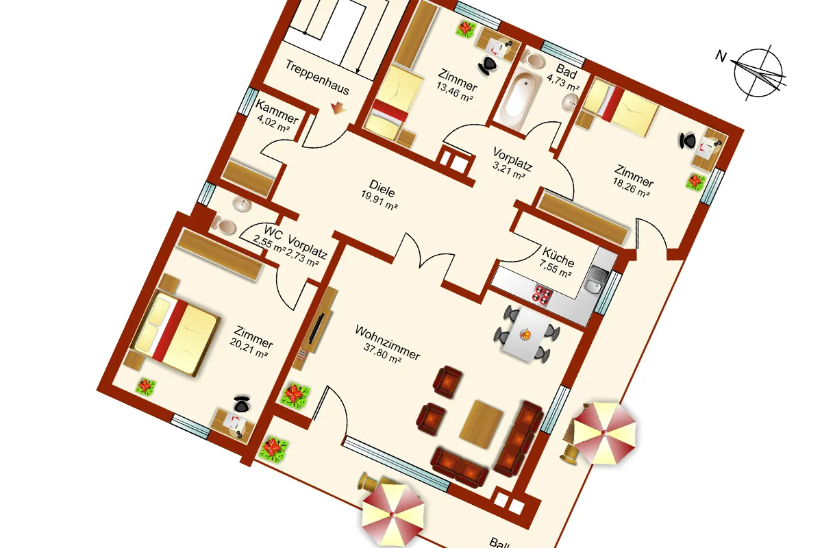 En plus des séances de photos professionnelles, des plans d'étage en 2D font également partie du dossier de présentation. Elles sont graphiquement attrayantes, avec tout ce qui va avec, boussole, dimensionnement et coloration.